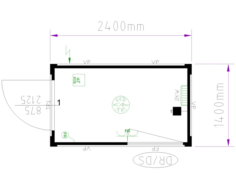 1 porte | 1 fenêtre | 1 plafonnier d’éclairage LED 8 W | 1 prise électrique | Radiateur soufflant 2 kW | Sol alu strié