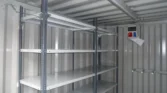 Container de stockage Containex 20 pieds équipé : Plancher acier | Pack électrique (2 rampes LED eu plafond, interrupteur, tableau électrique, 2 prises) | Fenêtre avec barreaudage | Porte de service métallique | 2 grilles d’aération 200 x 650 mm | Couleurs standard (RAL 5110, 9010 ou 7035) | Rayonnage métallique avec 5 étagères (H : 1981 mm / Prof : 500 mm) sur une largeur